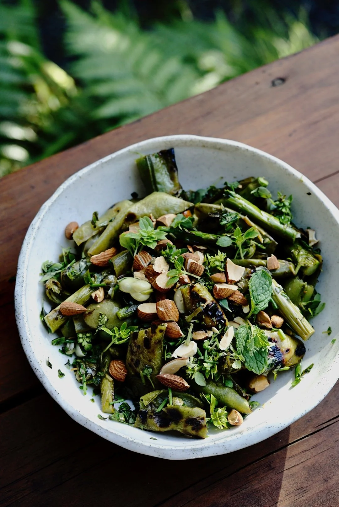Once the barbecued greens are cool enough to handle, chop into bite sized chunks. Lay in a big salad bowl, scatter with herbs, almonds (if using) and spoon over caper dressing mix. Add salt, if you like (the capers may add enough saltiness… depending on your preferences). Enjoy a bowl of springtime goodness.